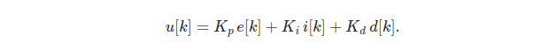 The goal of this project was to perform a PID reactive control capable of following the line painted on a racing circuit. PID control is one of the fundamental concepts of Linear control systems. The Controller continuously calculates an error value as the difference between desired output and the current output and applies a correction based on proportional, integral and derivative terms(denoted by P, I, D respectively). The control signal u[k] for a PID controller can be expressed as follows.